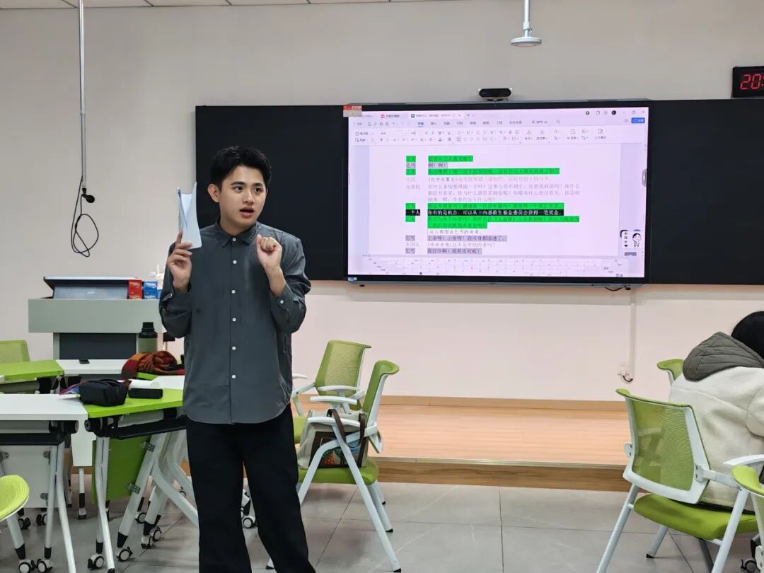 一位同学创作了男市民夫妇十天前收养小猫的故事,展现了这对夫妻如何溺爱孩子,甚至纵容他虐待动物,进一步揭示了他们的性格特征;另一位同学从妓女的视角写了一篇内心独白,描述她如何从一个纯洁的少女被迫走上行骗之路,表达了她对自我身份的厌恶与对自由的渴望;还有同学构思了工人与侄子联手行骗的后传故事……在分享环节,黄老师对大家创作给予了细致点评,并提出改进建议:“故事中的转折需要更大的冲突来推动,如果一个人物要发生根本转变,必须有一个非常重大的事件。轻易实现的转变缺乏说服力。”