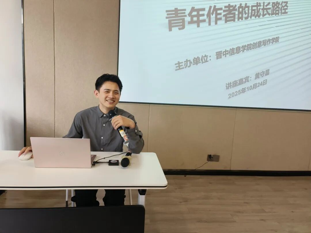 10月24日下午,复旦大学创意写作硕士、广州华商学院教师、作家黄守昙做客晋中信息学院,面向创意写作学院同学开展“青年作者的成长路径”专题讲座。黄老师看似年轻,但拥有丰富的创作经验与不俗的文学成就,他以颇具感染力的语言,从写作心理、写作技术、写作材料等方面向同学们进行分享。