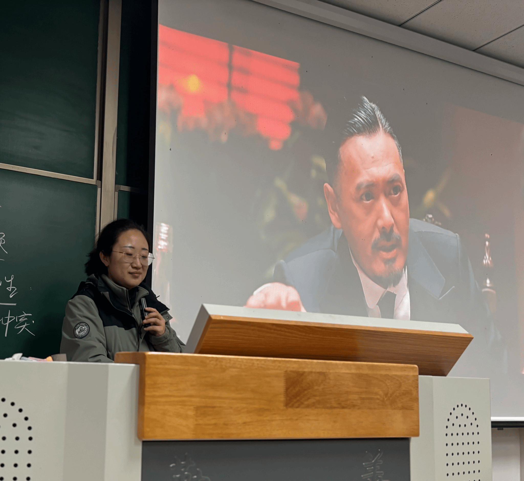 在案例解析环节,周立萌老师接过教学接力棒,通过多媒体设备播放《让子弹飞》中“鸿门宴”经典片段——张牧之、黄四郎、汤师爷三人围坐饮酒,表面推杯换盏、言辞客气,实则暗藏机锋、步步为营。片段播放结束后,周老师结合画面与台词,逐层拆解戏剧语言的表达技巧:“‘我来鹅城只办三件事:公平、公平,还是他妈的公平!’这句台词看似直白粗放,却以重复强化立场,既符合张牧之的草莽英雄人设,又暗藏与黄四郎的权力对抗,是戏剧语言‘言简意丰’的典型体现。”