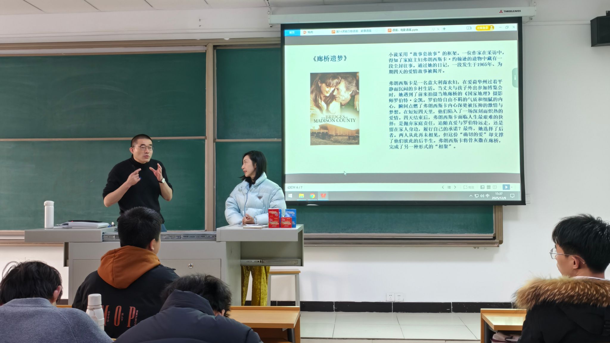 两位老师单独授课后,两人又以同台的方式,对小说和电影里的“叙事语言”进行了深度的对比和解析,他们重点分析了电影《廊桥遗梦》里叙事语言的风格和演员在镜头下的卓越演技,这些因素的集合才创造出这部经典电影。两位老师的精彩合作使同学们得到很好的课堂体验,同学们都表示获益匪浅,最后课堂在同学们热烈的掌声中结束。最后,贾老师鼓励学生在写作中运用这堂双师课上所学的知识,积极探索各种叙事类型,从而形成自己独有的叙事语言风格。