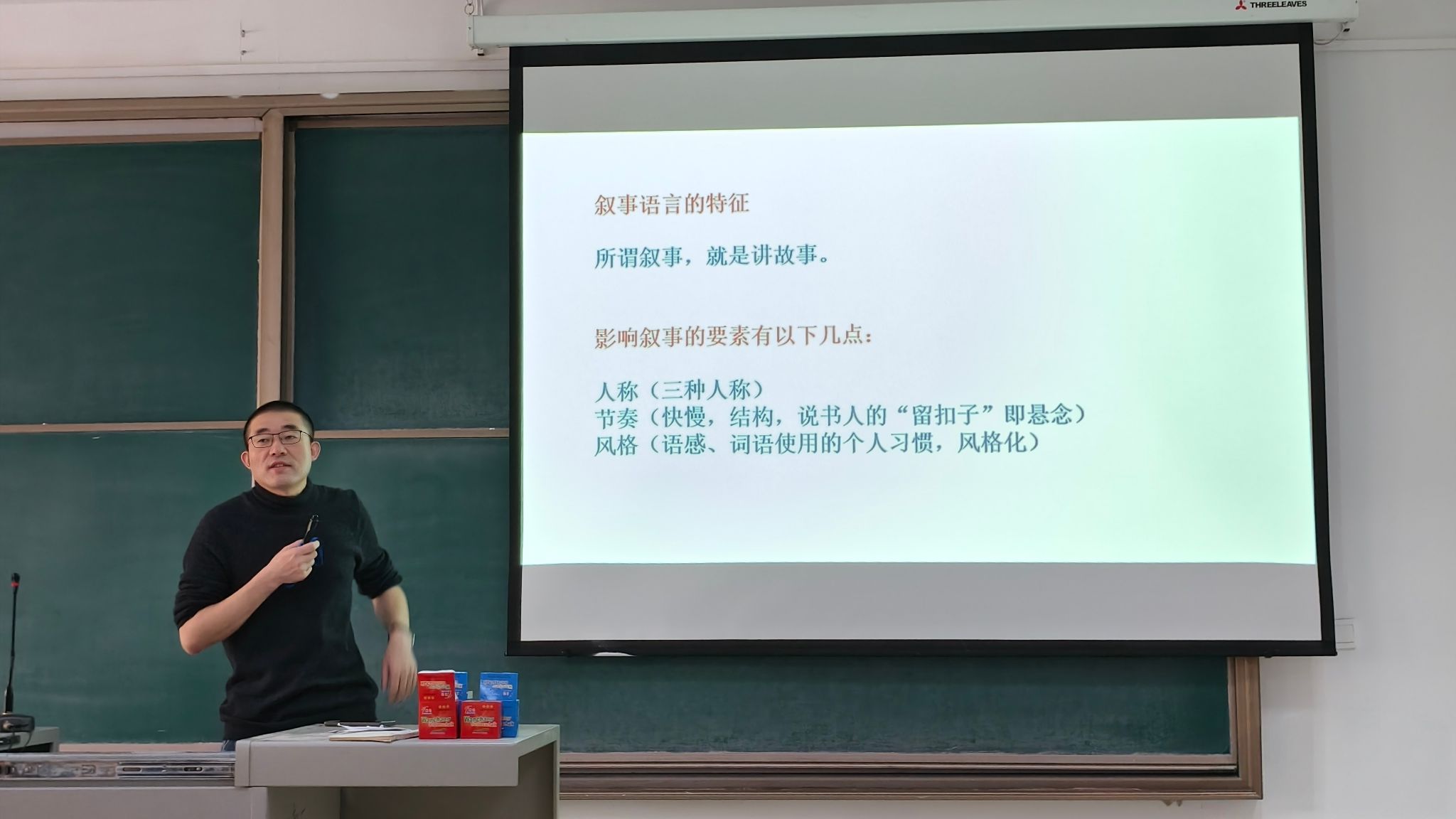 本堂课的授课内容以“叙事语言”为基本教学主题。贾老师首先对小说和故事写作中的“叙事语言”进行了阐释,并且以莫言的小说《红高粱家族》和沃勒的小说《廊桥遗梦》的语言风格和叙事结构进行阐发,剖析了小说写作的叙事类型和个人风格,指出叙事语言不是对日常生活的模仿和简单重现,而应该是提纯和创造。