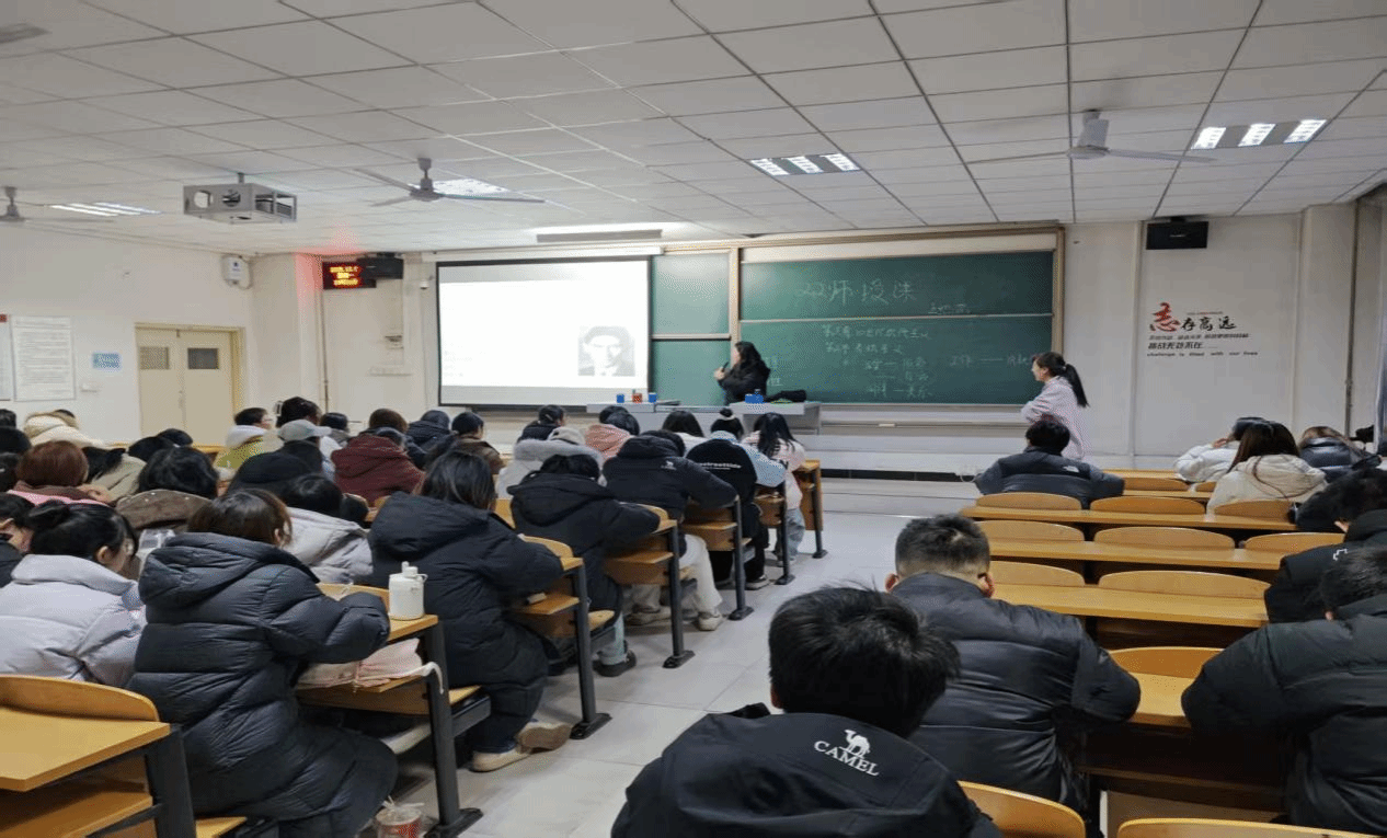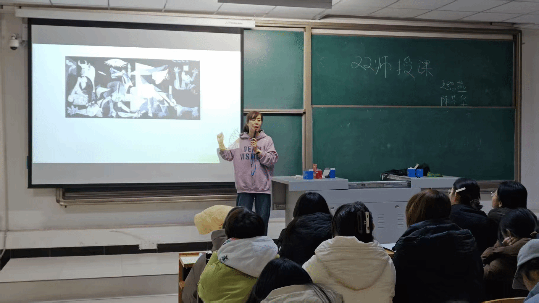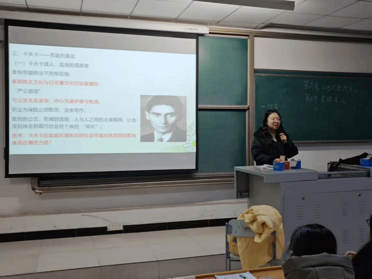 12月8日19点的2教203教室,同学们迎来了一堂别开生面的双师课,本节课讲授内容为《300年来的世界文学》课程中的第六章现代主义中第二节表现主义文学,课上王绍燕老师从毕加索《格尔尼卡》作品作为导入,让同学们了解到现代主义产生的背景,与社会环境的变革、思想的革新、技术冲击等因素有密切的关系。王老师还讲道:表现主义作为现代主义的重要分支,兴起于一战前后,核心是“以主观表现客观”,通过夸张、扭曲的手法直击事物本质,与现代主义“向内探索”的内核高度契合。卡夫卡作为表现主义的代表作家,他的作品以荒诞的情节、冷峻的笔触、深刻的隐喻,精准捕捉了现代人的孤独、异化与精神困境,其创作风格被后世命名为 “卡夫卡式”,深刻影响了加缪、萨特、马尔克斯等作家。