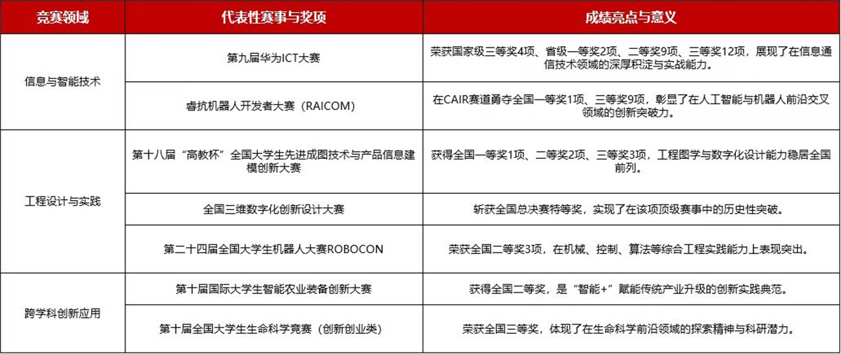 学校将高水平学科竞赛作为检验教学成效、激发创新潜能的核心阵地。2025年,信院师生在各级各类赛事中奋勇争先,取得了突破性的优异成绩。